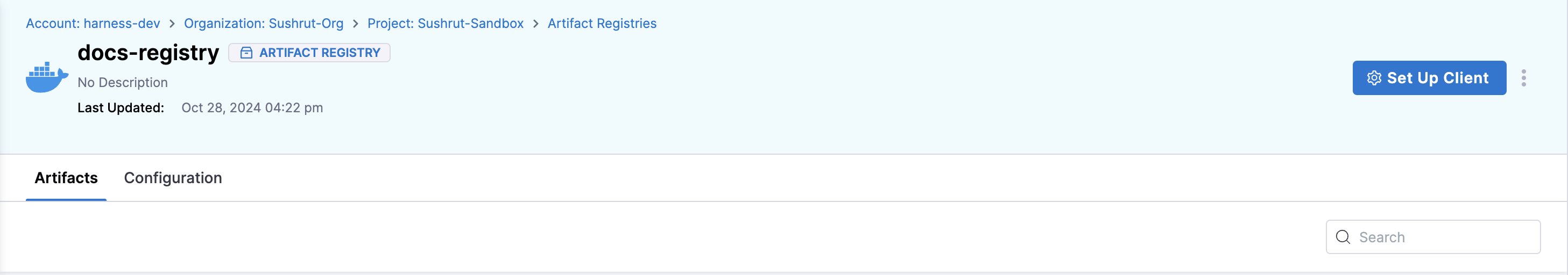 All artifact operations start with the Setup Client page found inside your registry at the top right.