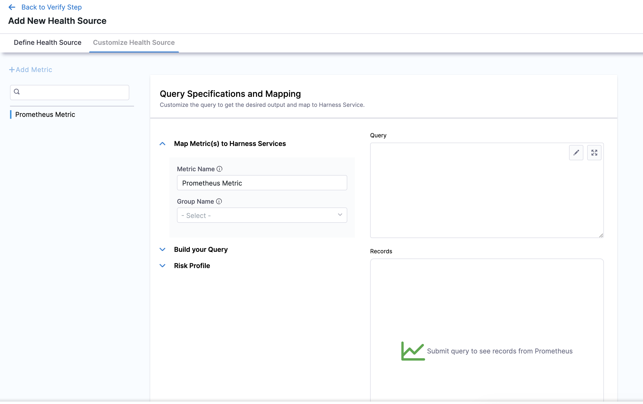 The subsequent settings in Customize Health Source depend on the Health Source Type you selected. You can customize the metrics to map the Harness Service to the monitored environment.