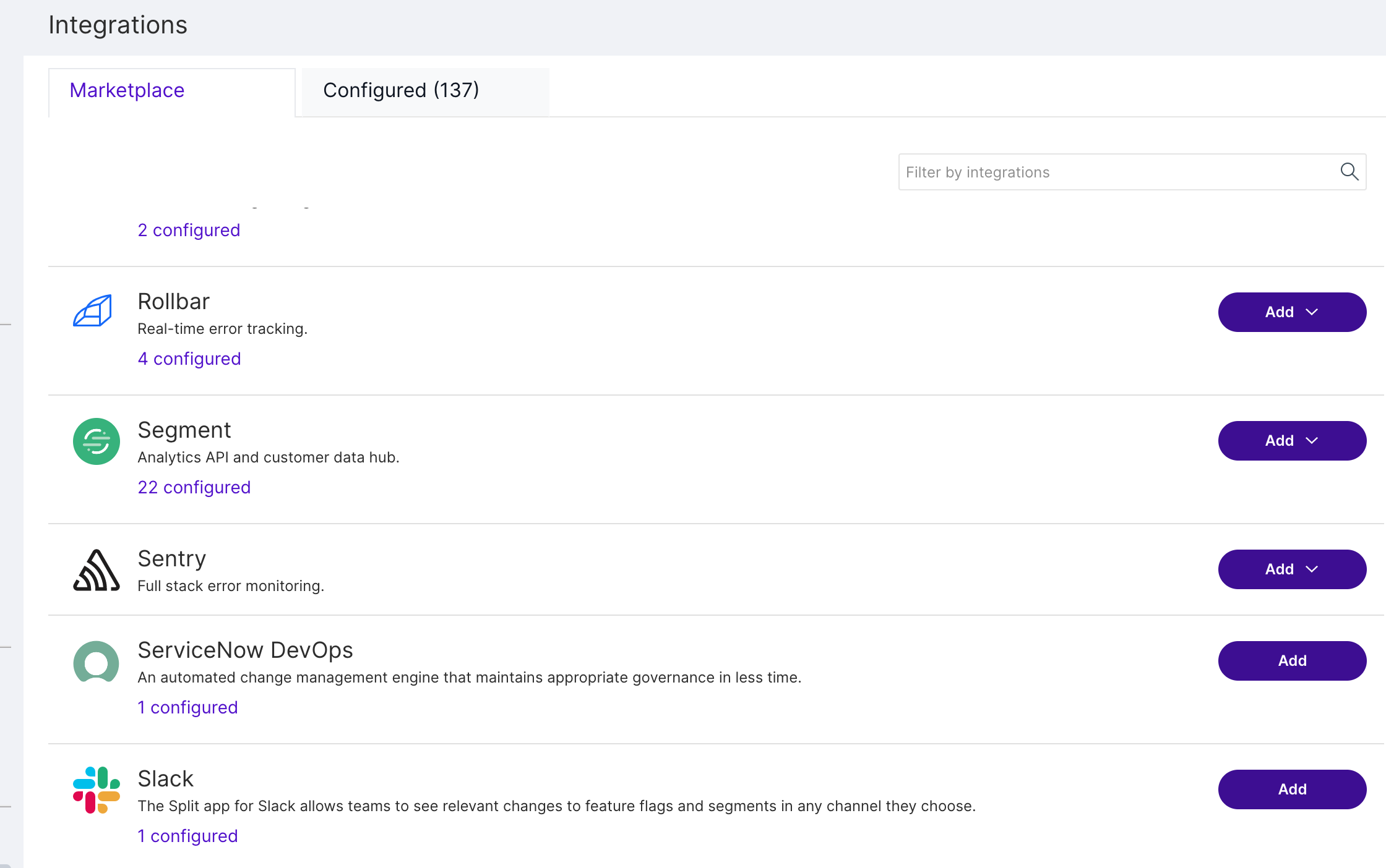 2. Click Integrations and navigate to the Marketplace tab.