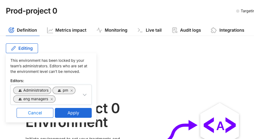 As an alternative, you can use approvals for an environment. Approvals can be optional or required. If you want to limit publishing changes to an environment, instead of restricting edit rights you can gain greater flexibility, in many cases, by allowing anyone to edit feature flags and segments, but preventing them from publishing those edits without approval. Instead of limiting editors, using approvers can potentially eliminate a bottleneck in getting updates into sensitive environments.