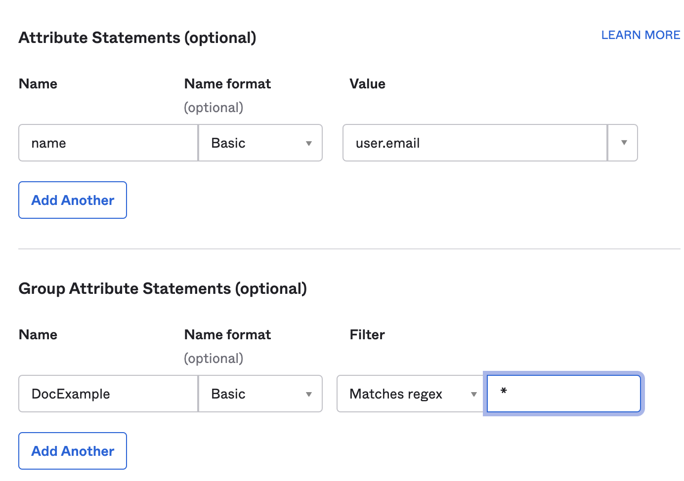 In Attribute Statements (optional), enter name in the Name field, select Name Format as Basic, and select the Value as user.email.