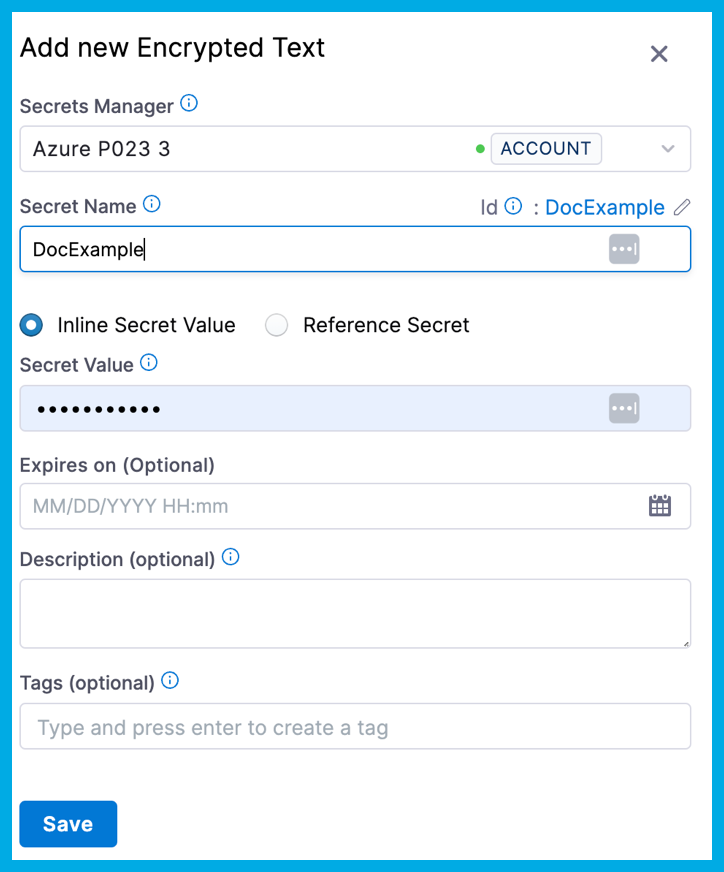 • Inline Secret Value: Enter the value for the encrypted text. If your secret is managed by Azure Key Vault, you can set an expiry date in Expires on. The Harness Delegate version 79306 is required for this feature.