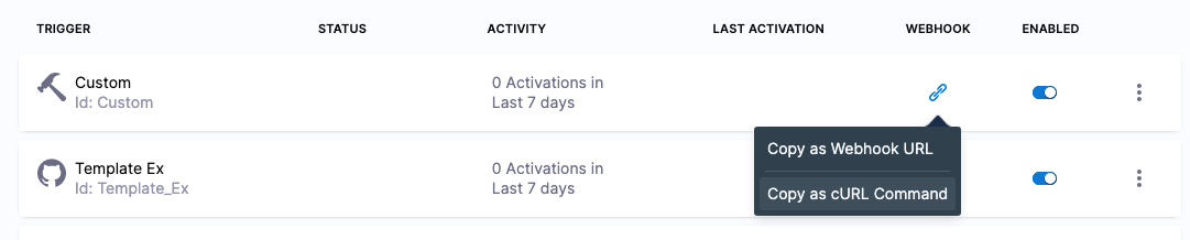 1. On the Triggers page, in the Webhook column, select the link icon for your trigger and then select Copy as cURL Command.